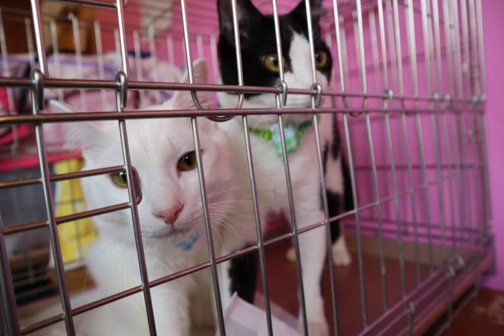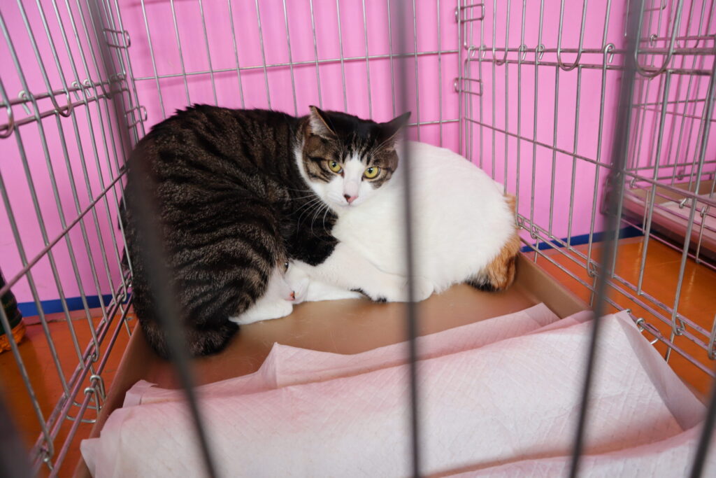 たくさんのかわいいネコちゃんたちが、ケージの中で思い思いに過ごしていました。