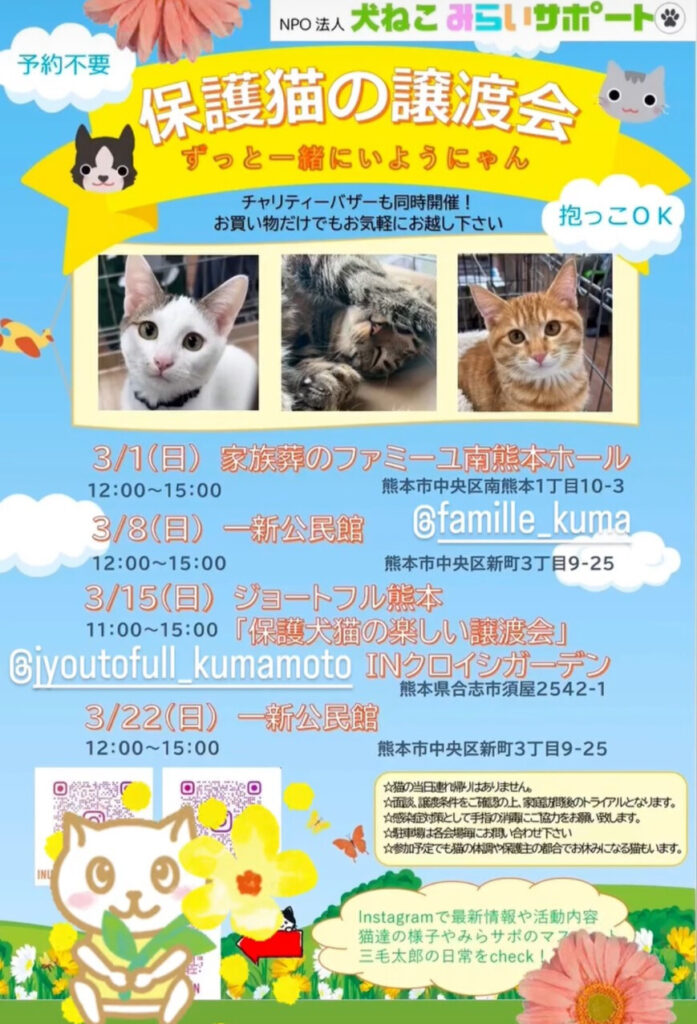 そんな中、熊本では3月も県内各地で犬や猫の譲渡会が予定されています。