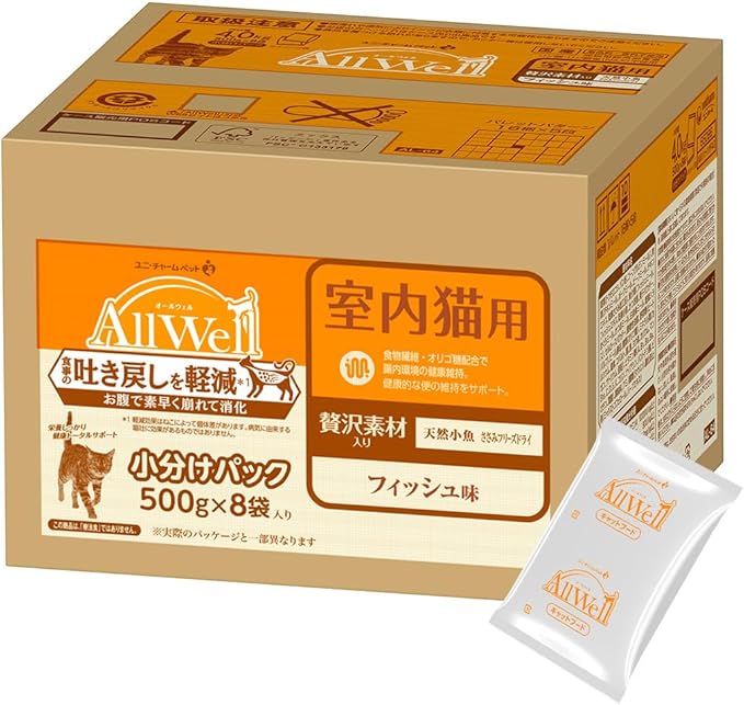 | 9位 | オールウェル 室内猫用(国産) | ドライ | 魚介・チキン | 吐き戻し軽減・国産 | 吐き戻しが多い猫 |