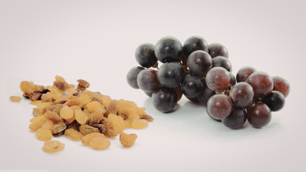 レーズンはぶどうの水分が抜けて成分が凝縮されているため、果実よりさらに少量で危険になります。ぶどうパンやフルーツ入りのお菓子にも注意が必要です。